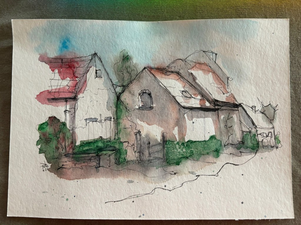 In this sketch, the farm, the basis was drawn with the continuous line technique. So basically, the pen is almost never lifted off the page. The technique may seem weird, but the results can be stunning. The water colour is added last. The texture of the green hedge was created by the use of salt. Yes, watercolor sketching is a bit of cooking :-). The salt is of course wiped away once everything is dry.