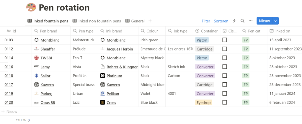 You can see that eg. my Opus 88 Jazz fountain pen was inked on 6/2/2024 with Cross blue black ink. When the pen is cleaned, I check the checkbox ‘Cleaned’ and add the date of cleaning. By doing this I can keep track of all my inked fountain pens and their history. I can create interesting lists to see how long I keep my pens inked, what ink I used mostly, … Below you see my current list of inked fountain pen, this is just a view based on my Ink & refills table: