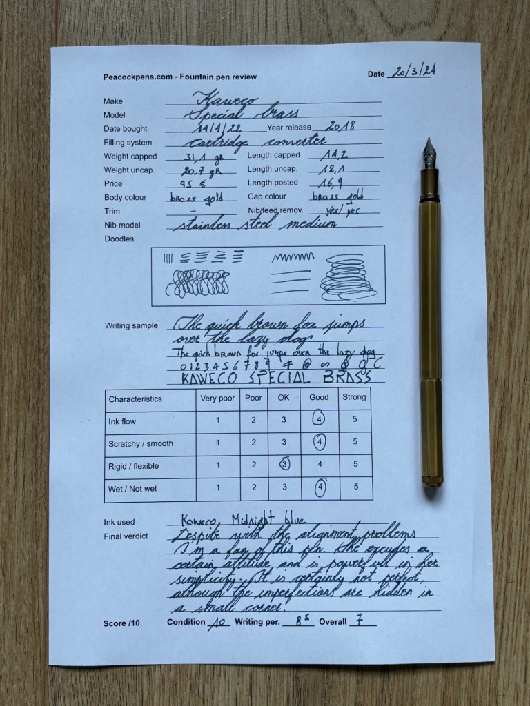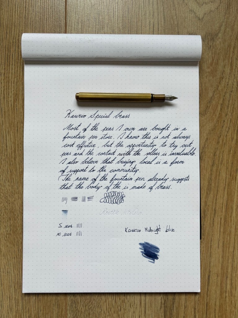Most of the pens I own (my Notion database says it’s just under 37%) I buy in a fountain pen store. I know this isn’t always cost-effective, but the opportunity to try out pens and the contact with the sellers is invaluable. I also believe that buying local is a form of support for the community. So I bought the KAWECO Special Brass at Penworld.be, a well-known store located in Antwerpen. They offer a large assortment of stationery, also online. I paid 95 Euro for this pen (today it’s around 100 Euro)