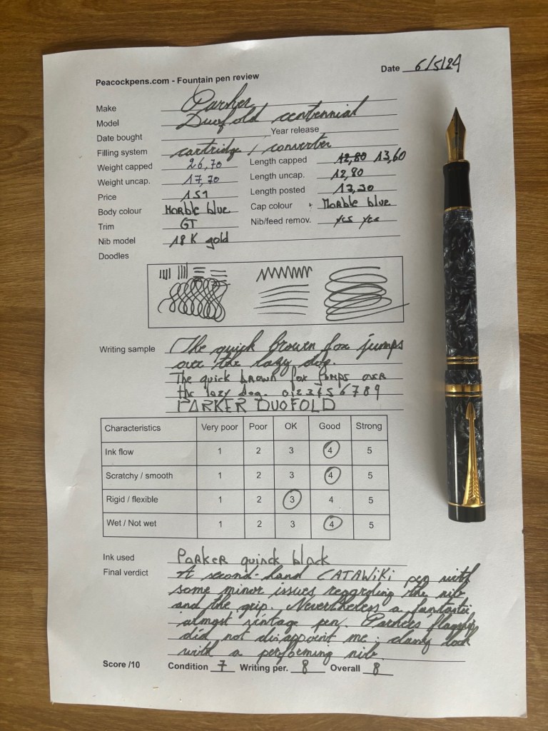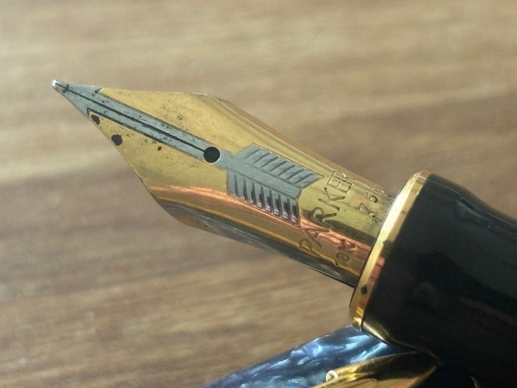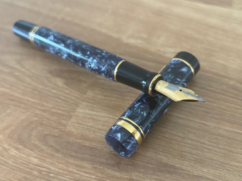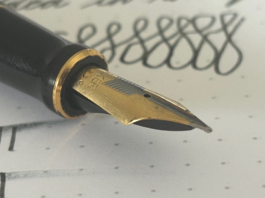 Regarding the writing performance, purchasing a second-hand fountain pen often means it may have been molded by a right-handed user. This shaping of the nib can influence the writing experience. While not necessarily drastic, it is noticeable that writing with the right hand using this Duofold is smoother and more consistent.